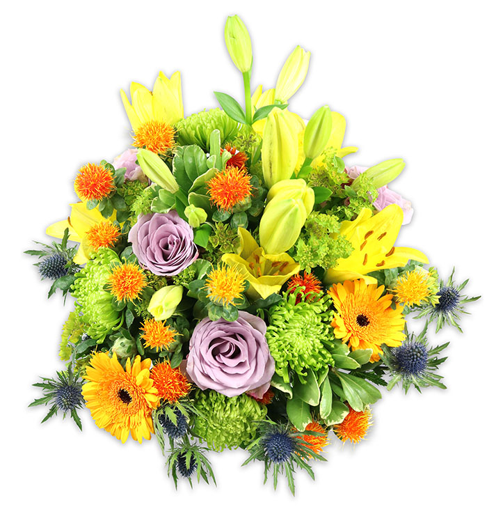 Delight in the vibrant beauty of our exclusive bouquet, perfect for any special moment. Featuring a stunning mix of yellows, oranges, greens, and a hint of blue, each flower is carefully arranged to create a captivating display.
